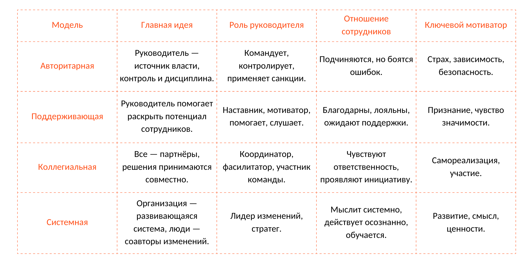 от контроля и власти → к заботе, затем к доверительным отношениям, партнёрству и наконец к осознанной, ценностной системе. Нельзя сказать, что какая-то модель «лучшая» — они дополняют друг друга и подходят разным организациям.