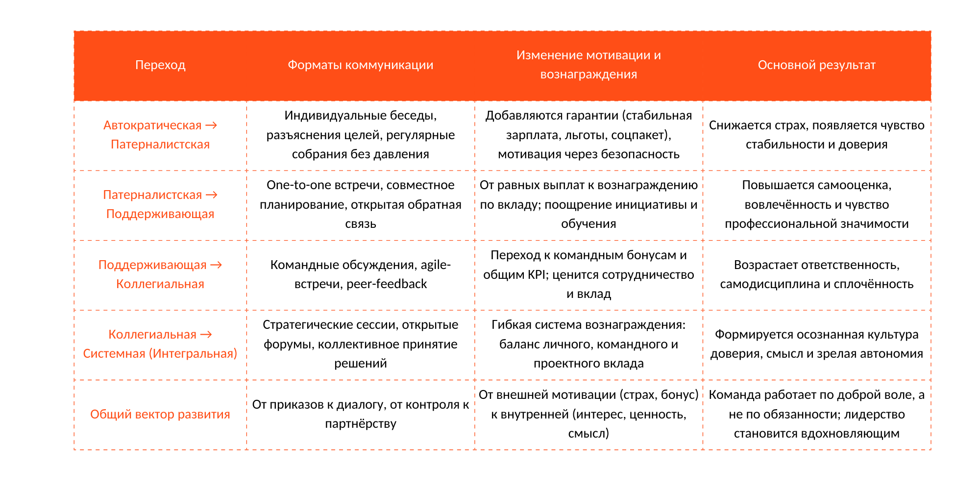 Каждый переход требует изменений не только в управлении, но и в коммуникации, системе поощрений и способах обратной связи. Каждый переход — это не только изменение структуры, но и смена способа мышления руководителя.
